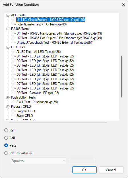 Functions related to the result of a previous test can be inserted into the condition by clicking Insert Test Function. This opens the dialog box shown in Figure 19. For example, to insert HAS_PASSED("XJDemo.IC11.IIC_CheckPresent") into the condition, select the test IC11.IIC_CheckPresent from the list, select the Pass radio button, and click OK.