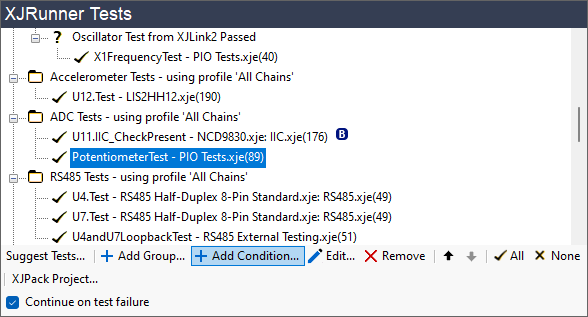 By default, if a test fails, XJRunner is set to stop at that point rather than continuing through the test list. However, if you are using conditions that will stop tests executing that you wouldn't want to run on a faulty board (e.g. to stop a failing board from being programmed), it is recommended that you override the default. Allowing testing to continue after a failure in this situation can be beneficial because the additional testing might provide useful insights into the cause of the failure, and the conditions will prevent unwanted tests from running. When a condition is added, you will therefore be asked if you would like to override the default setting by enabling Continue on Test Failure.
