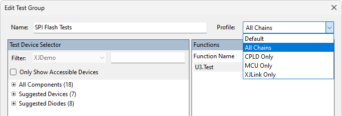 Each test group can be associated with a Profile that determines which JTAG chains and external hardware are active during the tests in the group.