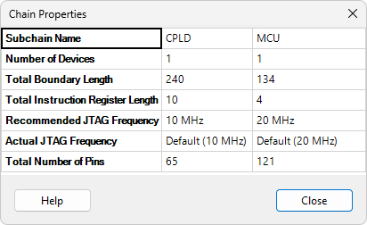 - Recommended JTAG Frequency - displays the recommended JTAG frequency, which is the lowest frequency read from the BSDL files for the devices in your JTAG chain or subchain.