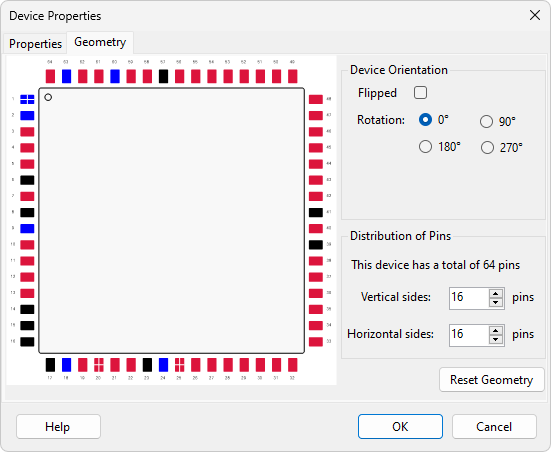 A graphical representation of the device is shown, with the current position of pin one indicated by a black circle. You can alter several aspects of the device geometry:
