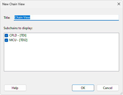 The New Chain View dialog allows users to add an additional Chain View pane to XJAnalyser. This pane will appear docked to the right of any existing chain views, or fully docked in the screen if no chain views are currently open. The Title of the chain view may be set and, if the project was created in XJDeveloper and uses the Dynamic Chains feature, the subchains to display may be selected. All of the subchains defined in the project, that include JTAG devices, are listed in the dialog. By default all subchains are selected. Individual subchains may be selected or unselected from the list. Only the selected subchains, that are used by the currently selected profile, will be displayed in the chain view.