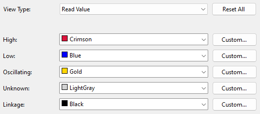 Here, colours for the different pin states in each view type can be configured. Select the view type in the drop down at the top of the window and the list of states in that view type will be listed with their currently assigned colour. Colours can be assigned from the specified colours in the drop down list or a custom colour can be selected by clicking Custom... and then choosing a colour from the colour picker.