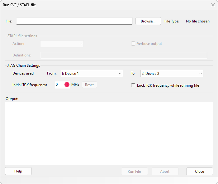 - In the Project menu, click Run SVF or STAPL file... to open the Run File dialog.