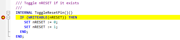 When a breakpoint is reached, code execution will be paused and the line that is about to be executed will be shown and highlighted on the relevant XJEase code editor screen. The corresponding call stack frame will also be shown.