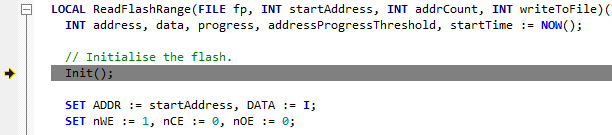 When context is switched to a frame that isn't the top frame, a grey arrow is displayed beside the current frame. The grey arrow is also displayed with grey highlighting on the corresponding line of code in the Test Code Editor.
