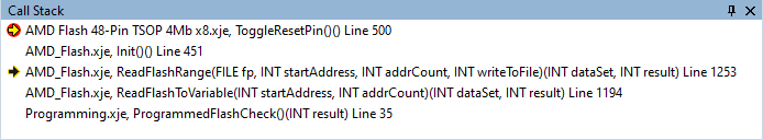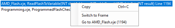 Every item in the Call Stack window is a call stack frame. The frame at the top of the stack is where execution is currently paused. Context can be changed to any stack frame by double-clicking on it in the list or right-clicking and selecting Switch to Frame. The XJEase Watch window will update with the selected frame's variable information. The relevant Test Code Editor will also be brought to the foreground with the corresponding line of code selected.