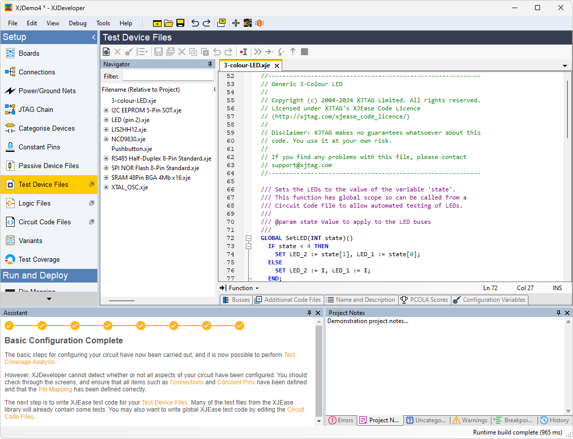 A full tutorial has been provided, explaining how to use XJDeveloper to set up tests for the XJDemo board supplied with the system. Other help can be found using the help for each of the main XJDeveloper screens.