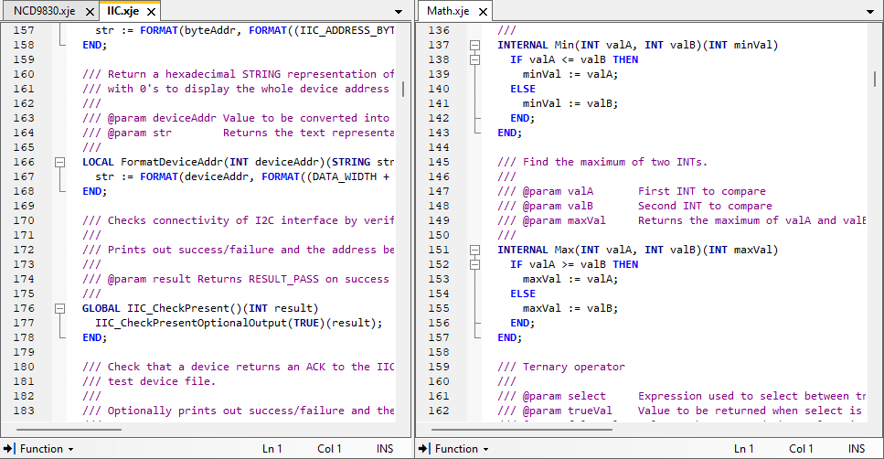 But like other dockable panes, they can be arranged within the screen as desired. For example, two code files could be placed side by side for comparison: