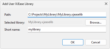 As well as the XJEase Library supplied by XJTAG, you can create your own user-defined libraries using the XJEase Library Editor application and reference them in XJDeveloper using this dialog.
