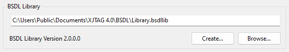 This textbox allows you to specify the path to the BSDL library to be used by XJDeveloper. This library acts as an index of available BSDL files enabling the correct BSDL file to be automatically found using the IDCODE of the device on your board. Either type a path or click Browse... to display a dialog to allow a file to be selected. Click Create... to create a new empty library.