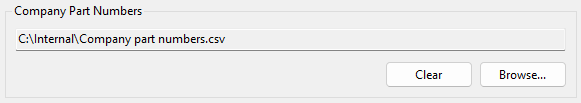 The path to the Company Part Numbers CSV file can be set here using the Browse... button. When changed, the file is checked for compatibility and an error will be displayed if there is a problem. Use the Clear button to remove the current file set.