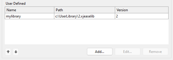 User-defined libraries are listed here, with their short name, path and build number. Libraries can be added, edited or removed, using the buttons under the control.