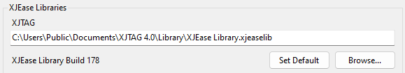 The path to the current XJEase Library downloaded from XJTAG can be specified either by entering it into this text box, or by using the Browse... button to find the file on disk. Click the Set Default button to select the default library which was installed with XJDeveloper. The version number of the library selected is displayed.