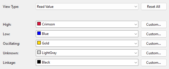 This control allows the colours used by XJAnalyser to be changed. First select the correct View Type (the most commonly used is Read Value which shows the value last read at each pin) and then select a colour for each of the available values for that View Type. Colours can be chosen from the pre-selected drop-down list or use the Custom... button to pick other colours.