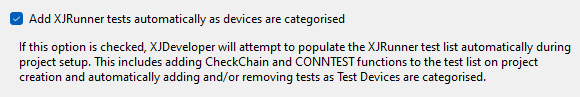 If the Auto Test List feature is enabled, whenever a new XJDeveloper project is created, the CheckChain and CONNTEST functions will be added to the XJRunner test list automatically.