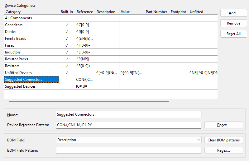 For each device category there is a single pattern for the device reference and patterns for any of the currently stored BOM fields, including user-defined fields. If a device matches the reference and optionally any of the BOM patterns specified then it is suggested as a member of that category.