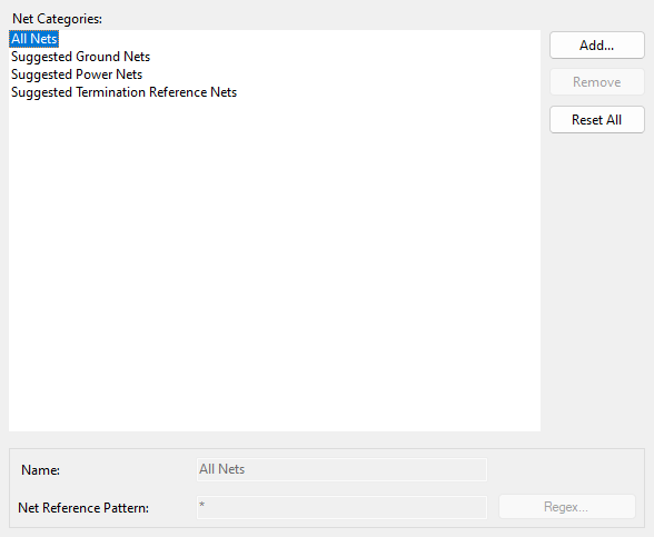 To reset all net patterns to the XJDeveloper defaults, press the Reset All button. This will reset all the category patterns and delete any user added categories. Categories can be reset individually by right-clicking an entry and selecting Reset Category from the context menu.