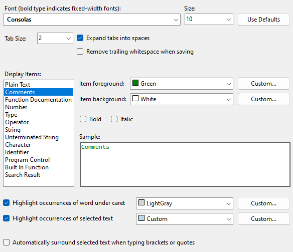 - If checked, pressing the tab key will insert a number of spaces a specified by the Tab Size. If not checked, then tab characters will be inserted instead.