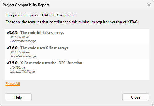This dialog displays the minimum version of XJTAG that is required to open the project and shows the features of the project that contribute to this.