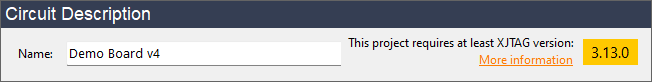 The minimum XJTAG version required to open the current project is displayed in the top right. Click the More information link to open the Project Compatibility Report dialog that shows the reasons for this minimum version.