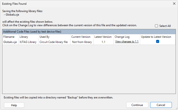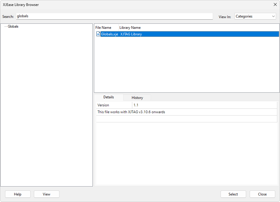 Projects created in versions of XJTAG prior to v3.11 will have a fixed version of Globals.xje that won't be updated from the library, or may not even have a copy at all. To upgrade these, go to the Circuit Code Files Screen and click the Add... button to add a new code file from the library: