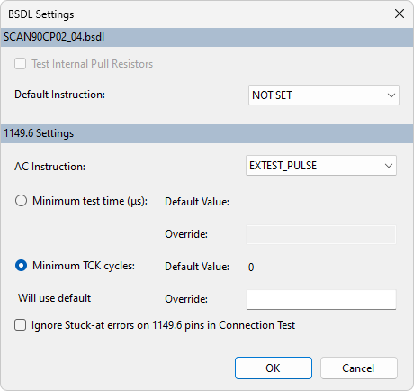 - AC Instruction - The instruction to use during the AC part of 1149.6 testing. The default value is EXTEST_PULSE, but EXTEST_TRAIN can be used if the manufacturer recommends it. Setting it to EXTEST prevents the chip being configured from taking part in the 1149.6 test, and it will behave as a 1149.1-compliant device throughout the connection test.
