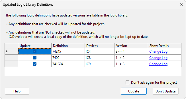 Each definition has a version associated with it. When your project is opened, XJTAG checks any logic definitions that are used in the project against the current library for newer versions. If any are found, the following dialog box is displayed: