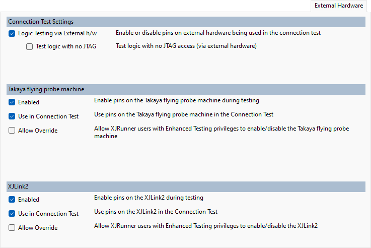 - Allow Override can be checked if you wish to allow an XJRunner user with the External Hardware Enhanced Testing privilege to enable or disable the external hardware for this project from within XJRunner, or left unchecked if you do not wish this to be changed.