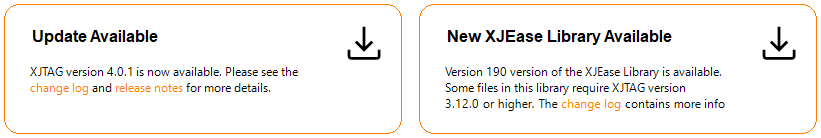 If updates to the XJTAG system or to the XJEase Library are available, then notifications will appear on the Start Screen. Click the Download button on the panel to initiate the update. There are also hyperlinks to view more information about what is contained in the update.