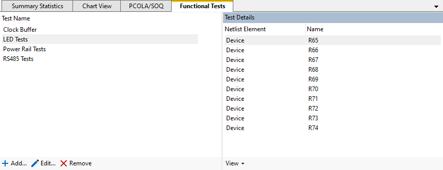 Each functional test requires a name and a selection of pins, nets or devices to assign functional coverage. The devices, nets and pins are added using the buttons on the right side of the dialog. Anything currently covered by the test is listed in the Test Details section.