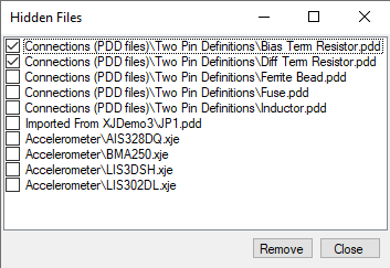 Files can be removed from this list by selecting each file to be removed by clicking each checkbox, and then clicking on the Remove button. The checked files will then reappear in the files panel, and be removed from the list of hidden files.