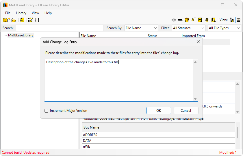 This will open the Document Changes dialog where you can enter a description of the changes made to be entered into the file's version history log. There is also a checkbox you can click if you want to increment the file's major version; the minor version is incremented by default. Making clear and detailed comments when documenting changes to your library files will ensure that when you come to updating your XJDeveloper projects, you will have a clear idea of how the updates will affect your project.