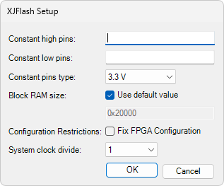 - Configuration Restrictions - normally you should leave the Fix FPGA Configuration checkbox unticked. Only tick the box if you have a problem with the number of LUTs/flip-flops required being more than the number available. This will result in a smaller but less configurable XJFlash image being generated.