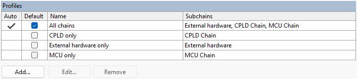 - This column is only visible when Automatic Configuration is enabled. The profile generated automatically by the system will have a tick. Being automatically generated means it will continue to track any future project changes to the JTAG chains ensuring to contain subchains for all TAP groups that contain all JTAG devices and external hardware.