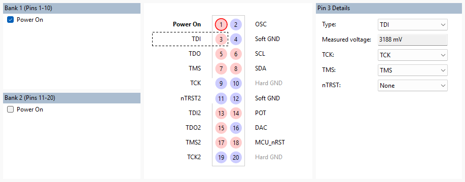 The XJLink2 connector is split into 2 banks: bank 1 (pins 1 to 10) and bank 2 (pins 11 to 20). The settings for bank 1 can be modified in the Bank 1 (Pins 1-10) panel on the top left. The settings for bank 2 can be modified in the Bank 2 (Pins 11-20) panel on the bottom left.