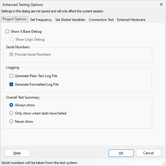 The Enhanced Testing Options dialog allows for some testing options set in Project Management to be overridden as well as offering additional debugging options.