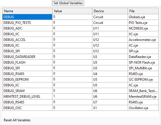This tab allows global variable values to be overridden in the current session. If a variable is referenced by more than one device, separate overrides can be defined for each device. Variables with values with active overrides applied are shown in bold.