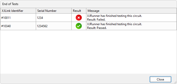 If you have more than one XJLink plugged into XJRunner, each gets its own tab on the main testing screen, and XJRunner can run tests on some or all of them simultaneously, in two modes. Whichever mode you use, each XJLink has its own testing tab for displaying results, and on the left of the screen an icon shows the status of the XJLink above its name (See Naming your XJLink).