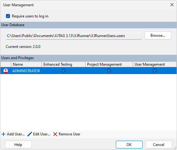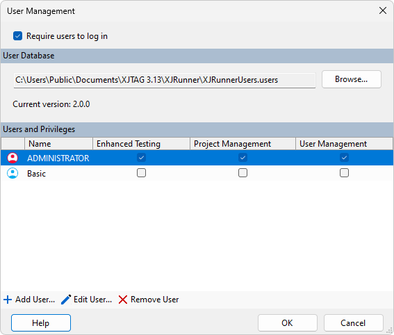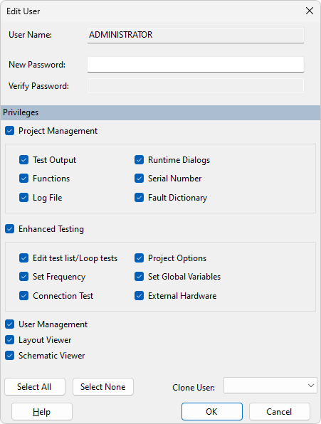All users can run the default tests (as set up in the Project management screen), but users can have additional privileges, which are enabled and disabled through the user management dialog. The default user, ADMINISTRATOR, has full privileges.